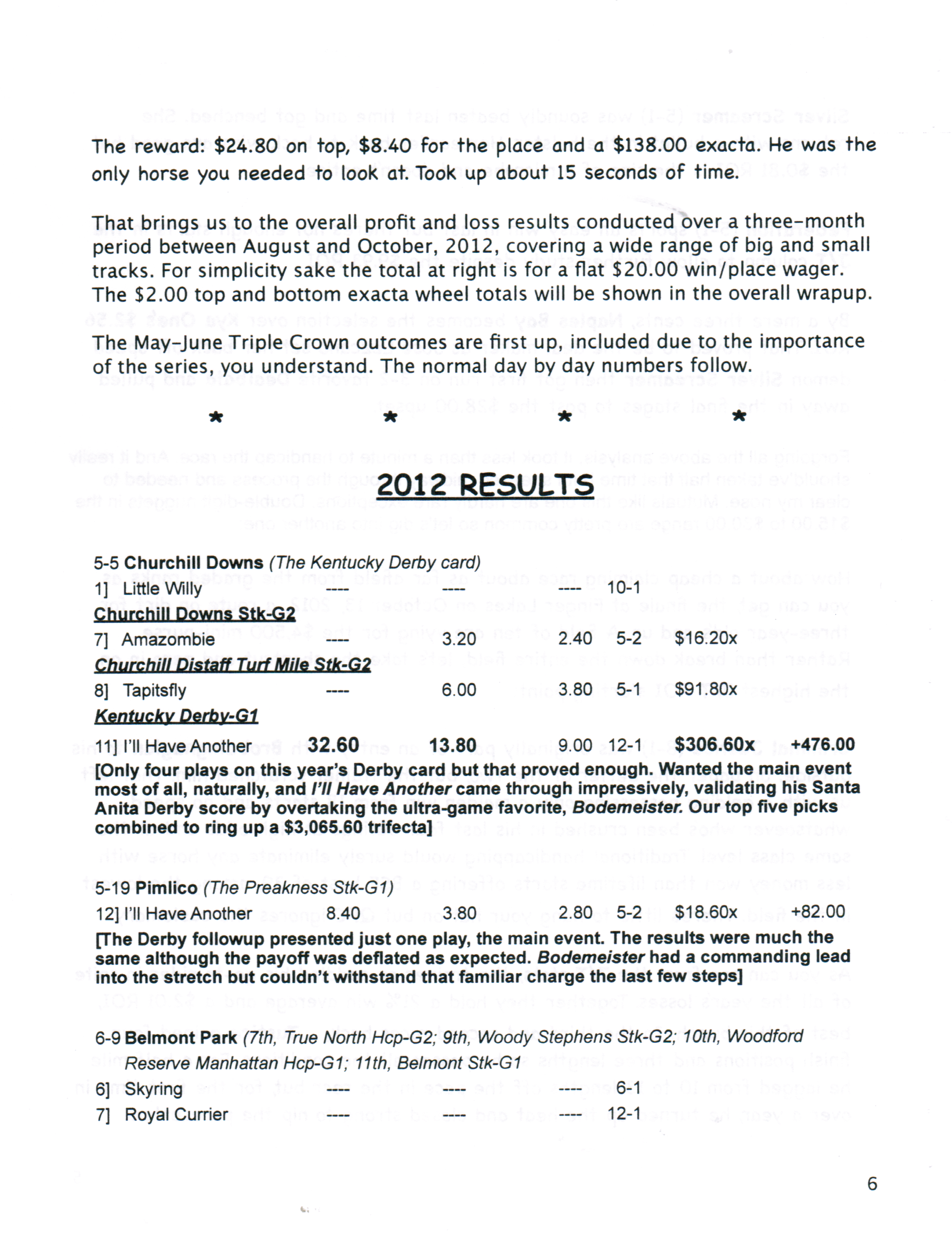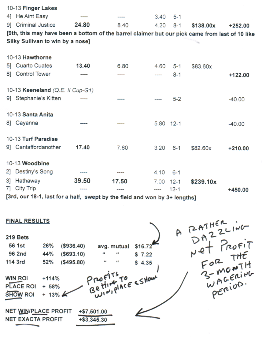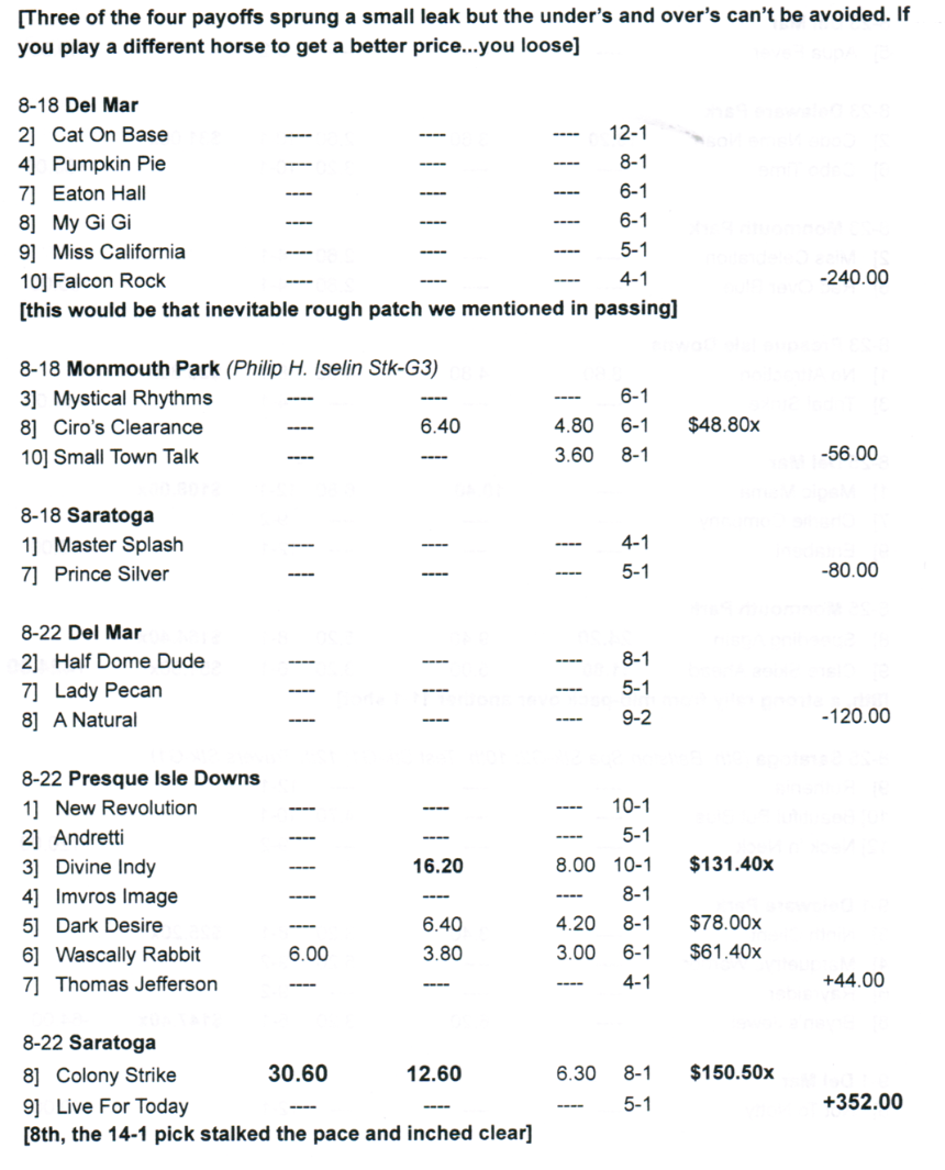 But even if you only bet $5 to win/place and $1 Exacta wheels, you will still enjoy substantial profits.