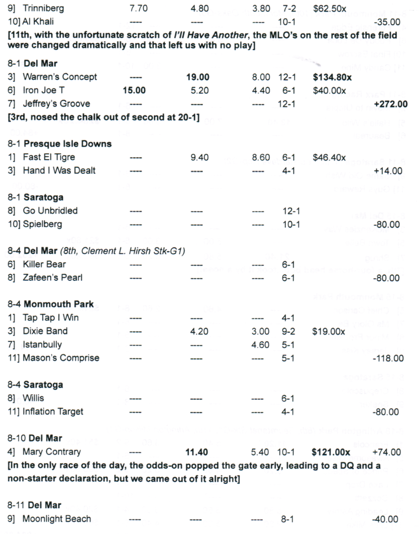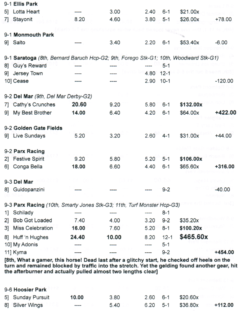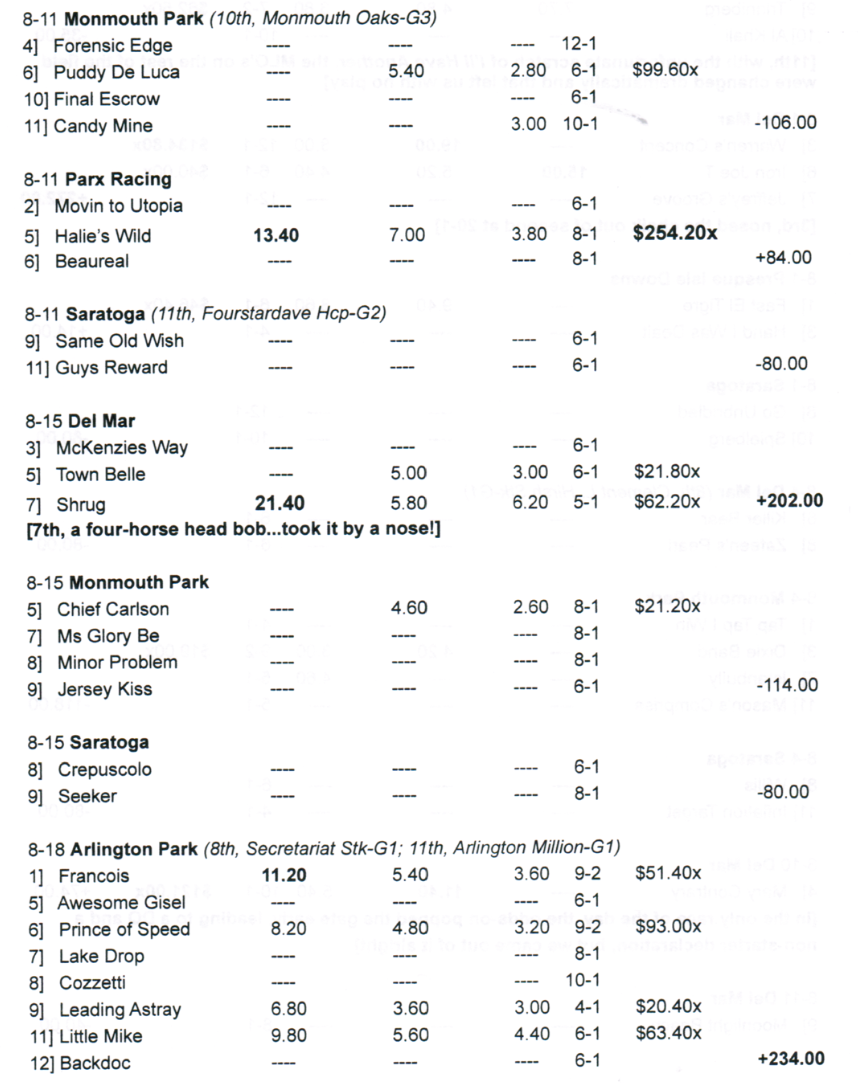 that he actually missed, ranging in price from $7.80 to $23.40 and a couple of the Exactas he missed paid $120+.