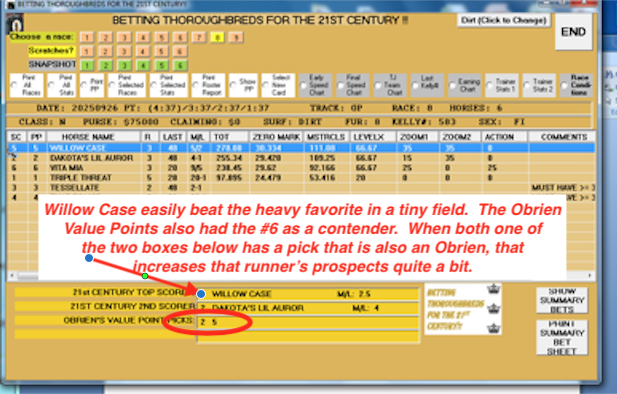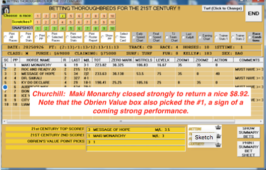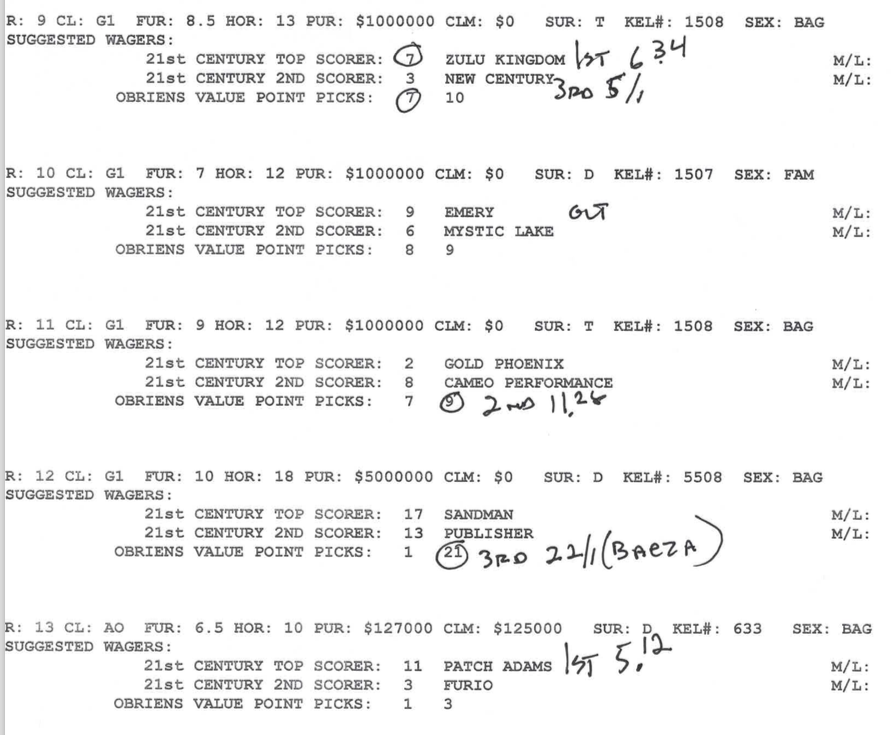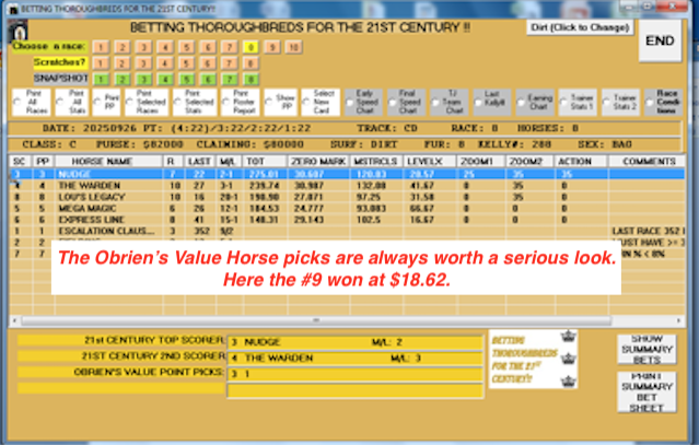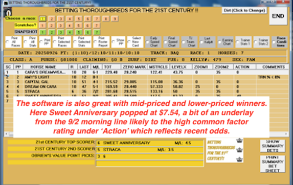 Note on the screenshots below you will also see a box at the bottom called Obrien’s Value Plays. This is a very sound methodology that came from one of Steve’s earlier publications in American Turf Monthly called ‘How to Make Money on Most Days at the Track’, in which he reveals a formula that does indeed put money in your pockets close to 75% of the days you wager. This feature can be used on its own but is extra potent in this software when one of the top selections is also mentioned in the Obrien Box.