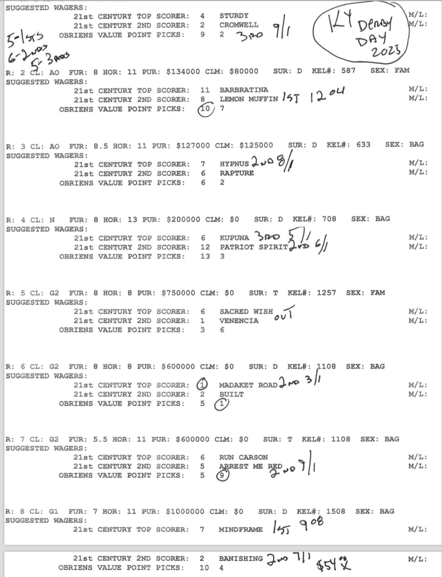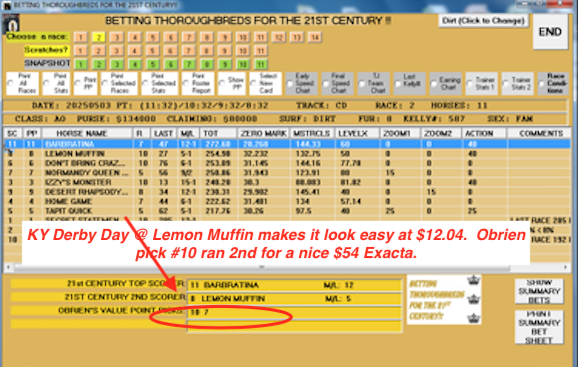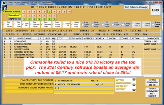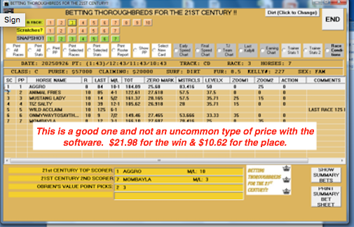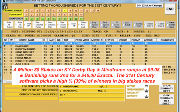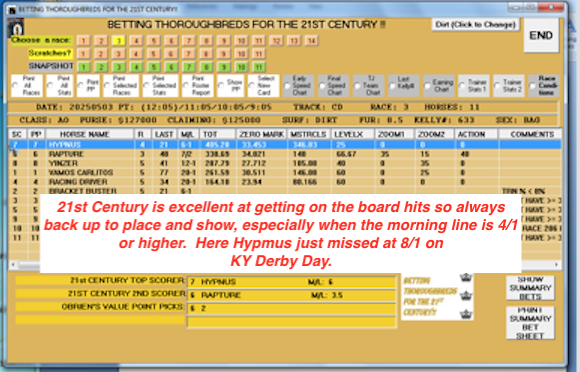One thing that has become our ‘gospel’ over the years when developing software, is that if a system, or methodology or software gets good to excellent results on the toughest kinds of racecards, i.e., Big Stakes Days, Triple Crown, Breeders’ Cup, etc., than it is going to perform even better on normal, or ‘average’ days where these tough to figure races are not present. In otherwords if the software is able to pick winners, including big prices, on the toughest cards, than it is going to hit an even high % on easier races. 21st Century fits this description to a ‘T’, and as an example look at its excellent performance on this year’s Kentucky Derby,
